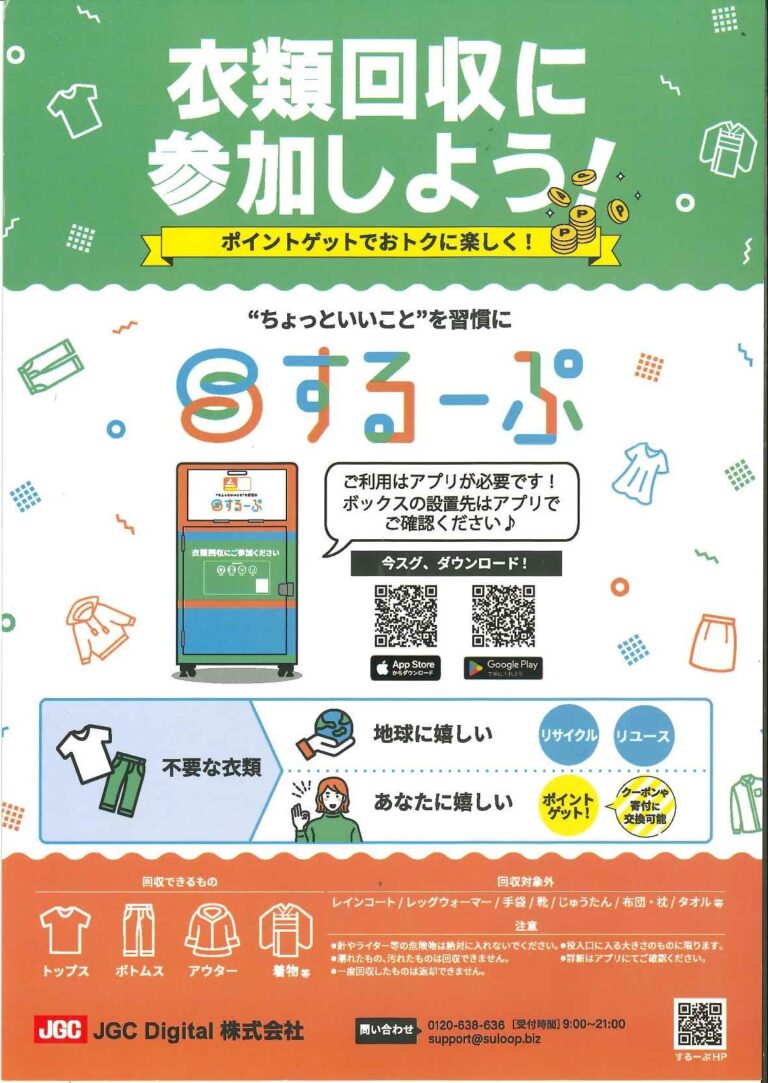 2025年11月15日より、スマートフォンアプリ「するーぷ」を活用した衣類回収実証事業が始まりました。 設置場所:ニットーモール2階 スマートフォンアプリ「するーぷ」をダウンロードし、要らなくなった衣類を回収ボックスに投 […]