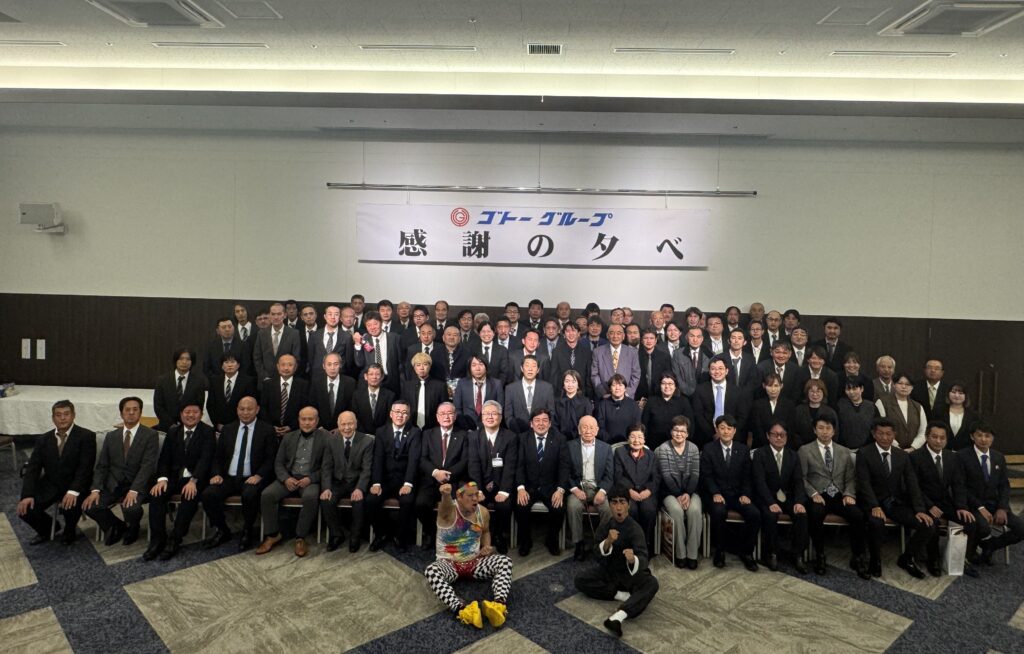 2025年12月6日、熊谷スポーツホテルにおいてゴトーグループ主催「感謝の夕べ」が開催されました。熊谷市副市長大島英司様、行田市長行田邦子様をはじめとする多くのご来賓にご臨席賜り、皆様より祝辞をいただきました。芸人の小西啓介様、チェリー吉武様にもお越しいただき、プレゼント抽選会なども行われ、盛大な式となりました。 シェア ツイート LINE Pocket